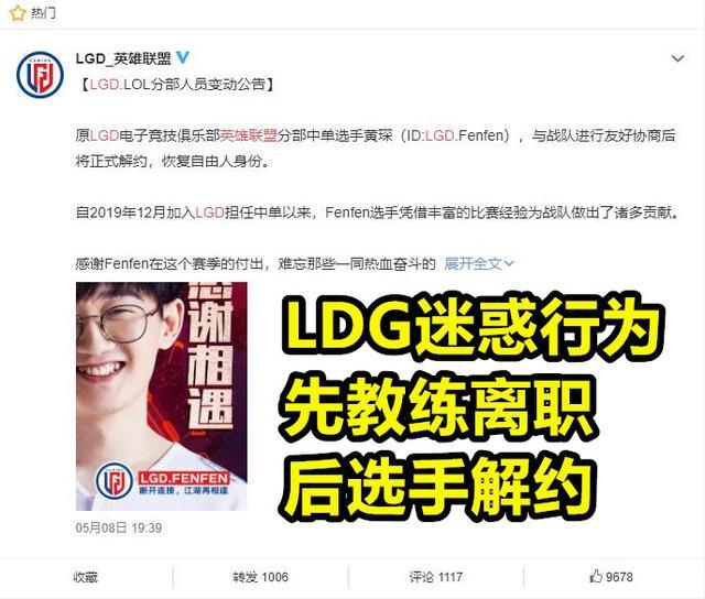 在5月8日晚,本身就迷惑操作不断,先后宣布主副教练离队的LGD又宣布中单选手fenfen与战队解约,恢复自由人身份。这个消息一出,不但在LGD的粉丝圈子里面非常让人重视,而职业选手圈子里面也是议论纷纷,毕竟现在还远未到转会期,春季赛刚过就和战队解约,很明显是一个不太好的信号,对于fenfen这名选手来说,一定会有什么不一样的影响。