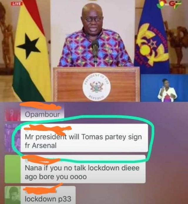 最近这段时间,一些国家的总统会出来公开讲话,甚至召开发布会来公布抗疫的最新进展,这其中诞生了不少有趣的事情。加纳总统前些日子在社交媒体上进行视频直播,结果有球迷乱入,问该国国脚托马斯-帕尔特伊会不会加盟阿森纳,可以算得上一股清流。