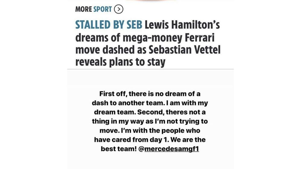 汉密尔顿在个人社交媒体上写道:“首先,我没有加入其它车队的想法,我现在与我理想的车队在一起。其次,我没有想转会,所以没有任何东西在妨碍我。我与那些从第一天起就一直关心着我的人们在一起。我们是最好的团队!@梅赛德斯F1车队。”