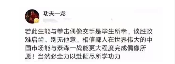 泰森多次所言的“不让职业拳击这项运动蒙羞”,以及这次所言“只会打纯粹的职业拳手;不能对职业拳击侮辱” 之表达之下,显然,“武僧”一龙们想借此蹭热度、玩炒作,已彻底失去了空间。