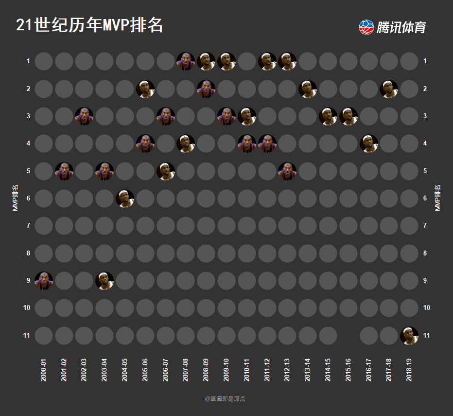 下图是21世纪历年MVP排名,若以个人荣誉而论,2018-19赛季算是詹姆斯的失败季,他勉强进了最佳阵容三队,在MVP评选中只排在第11位。要知道,除了菜鸟赛季,詹姆斯在最佳阵容评选中最差也进了二队,他在MVP评选中最差是新秀赛季的第9位。2018-19赛季前,詹姆斯连续13个赛季在MVP评选中进入了前5位,他连续11年入选了最佳阵容一队,但2018-19赛季,他的两项纪录全断了。