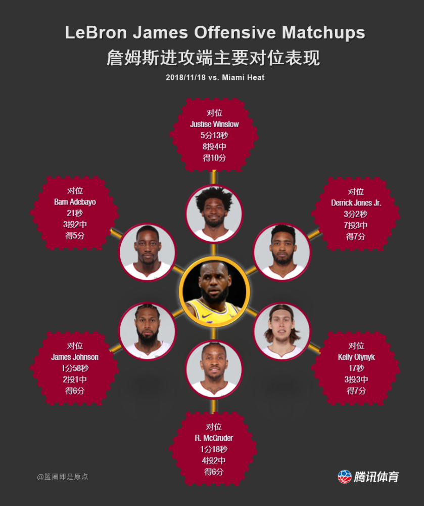 热火侧翼另一个防守悍将德里克-琼斯防了詹姆斯3分2秒,詹姆斯7投3中拿下7分。詹姆斯-约翰逊跟詹姆斯对位1分58秒,詹姆斯拿了6分。像阿德巴约、奥利尼克,他们只是偶尔错位对上詹姆斯。这里面,比较尴尬的是奥利尼克,轮换时间,湖人替补中锋泰森-钱德勒在场,他跟奥利尼克对位,詹姆斯频繁针对奥利尼克,不断呼叫钱德勒掩护打挡拆。奥利尼克只对位詹姆斯17秒,但这17秒里詹姆斯3投3中拿了7分。