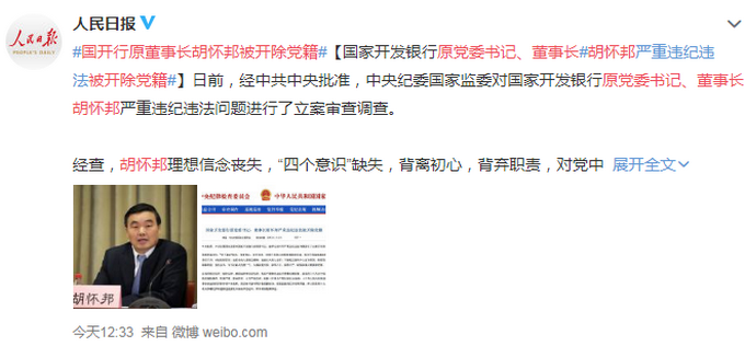 日前,经中共中央批准,中央纪委国家监委对国家开发银行原党委书记、董事长胡怀邦严重违纪违法问题进行了立案审查调查。