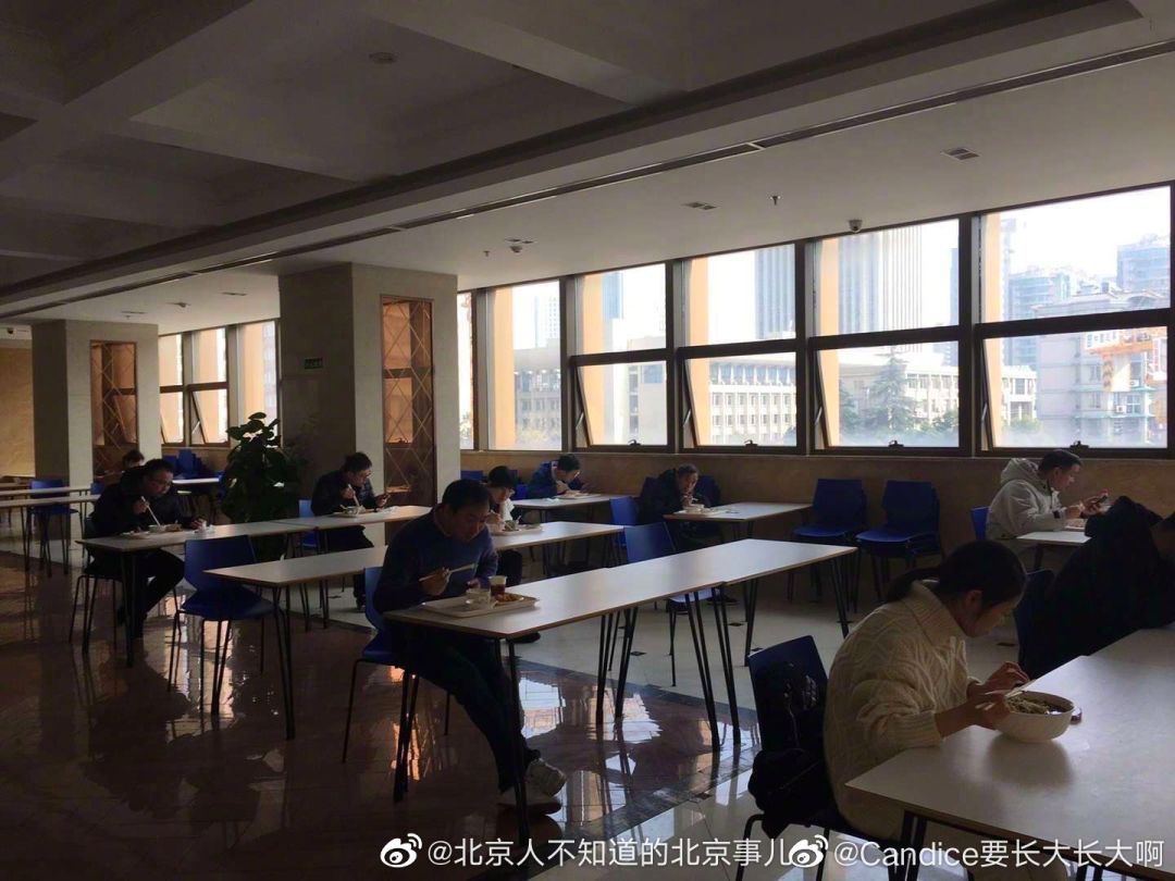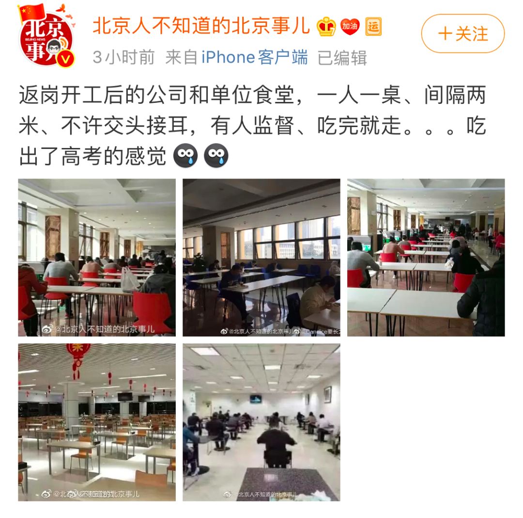 2月3日,一组员工在单位食堂进餐的照片,在网络和朋友圈刷屏。“各自为吃,前后左右间距均为1.5米,吃出了国考的感觉”、“间隔两米,不许交头接耳,有人监督、吃完就走,吃出了高考的感觉!”