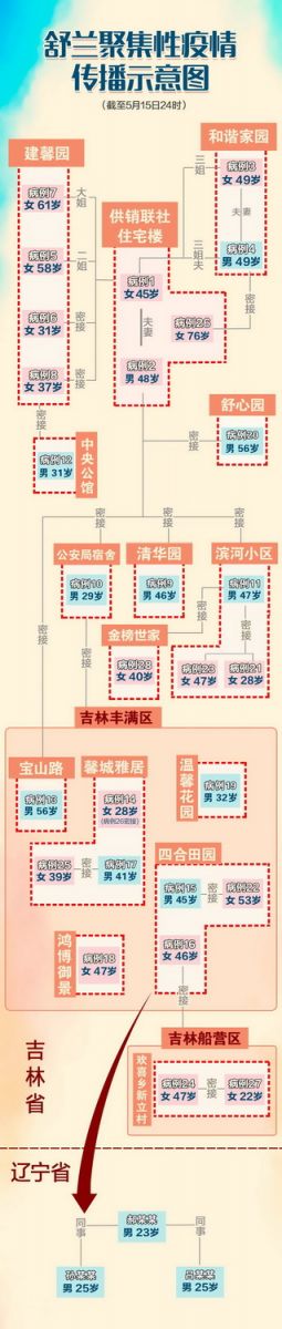 截至5月14日24时,舒兰本土疫情已造成31人确诊。其中,28人在吉林省吉林市,包括舒兰市17人、丰满区9人、船营区2人;3人在辽宁省沈阳市,均为同一单位员工。