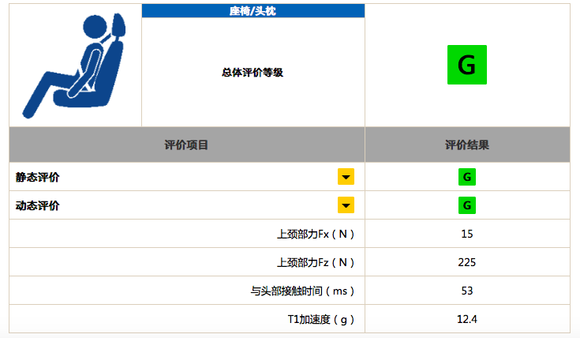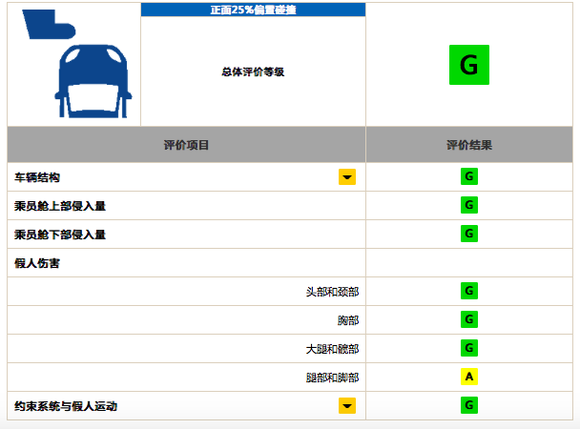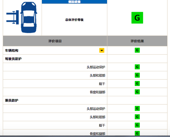 在车内乘员安全指数方面获得优秀(G)评价,其中正面25%偏置碰撞、侧面碰撞、车顶强度和座椅/头枕测评结果均为优秀(G)。