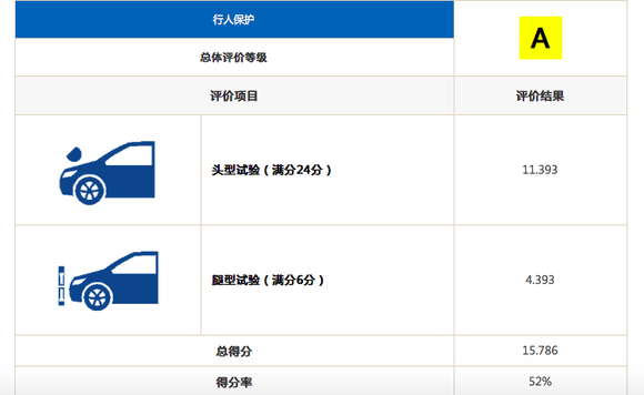 在车外行人安全指数方面,其头型试验得分为11.393分(满分24分)、腿型试验得分为4.393分(满分6分)、总得分为15.786分(得分率52%),最终获得良好(A)评价。