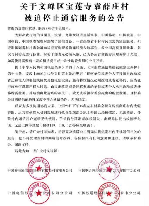关于文峰区宝莲寺袁薛庄村被迫停止通信服务的公告。 根据公告,当地村委干部表示,(线缆)必须入地,已为各运营商做好预埋并穿了光缆,如需使用需要出一定的租赁费或一次性购置费用约十几万元。运营商无法承担村委会提出的购置费用,且村委会目前提供的地埋光缆不符合通信条件,无法迁改。