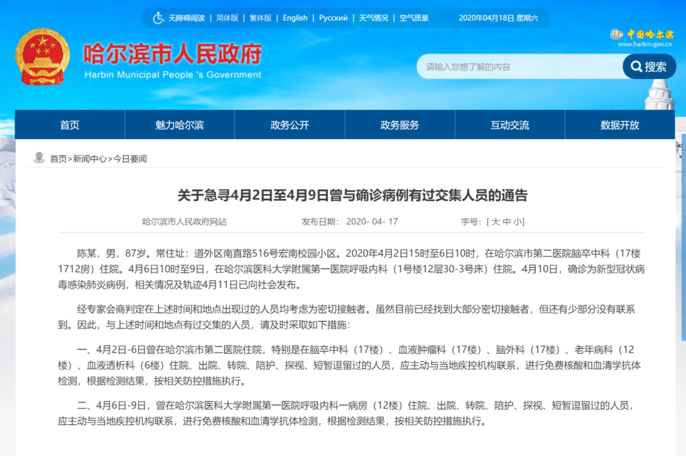 另据哈尔滨市应对新冠肺炎疫情工作指挥部4月17日晚发布的关于急寻4月2日至4月9日曾与确诊病例有过交集人员的通告。