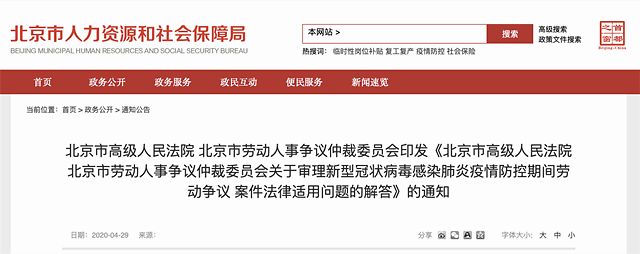 4月29日,北京市高级人民法院与北京市劳动人事争议仲裁委员会联合发布《关于审理新型冠状病毒感染肺炎疫情防控期间劳动争议案件法律适用问题的解答》,围绕疫情防控期间劳动争议案件审理中亟待解决的具体问题作出规范和回应。