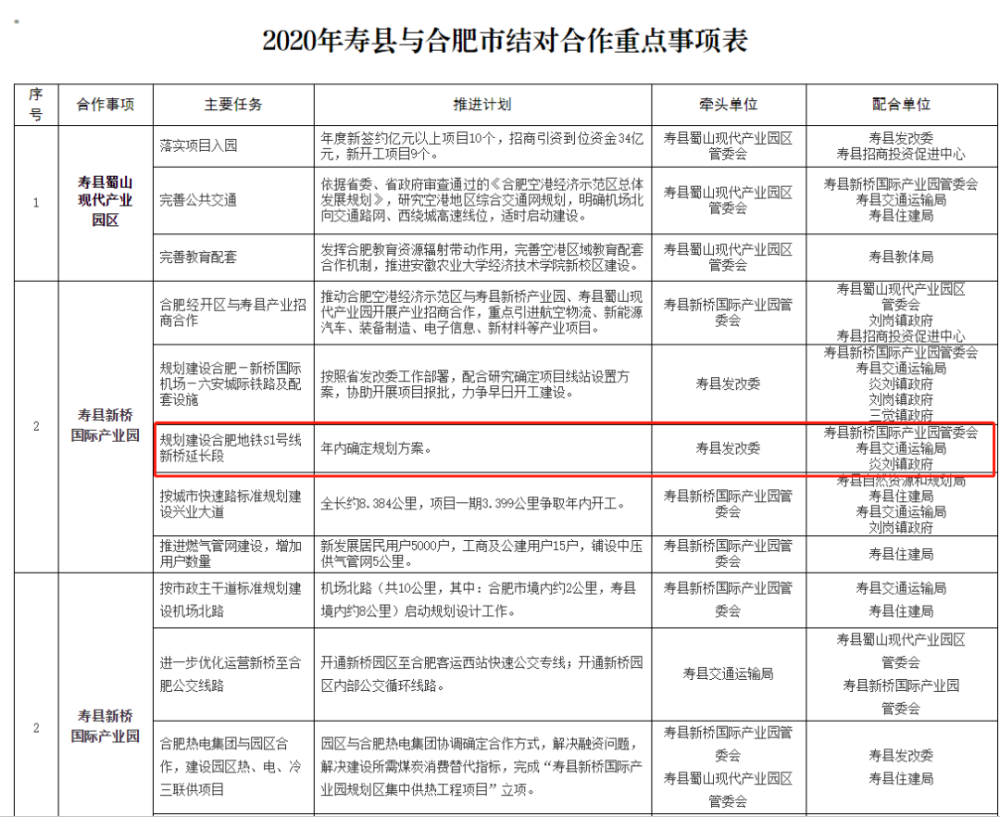 从寿县与合肥市结对合作重点事项表来看,正在规划建设合肥地铁S1号线新桥延长段至寿县新桥产业园,并计划在年内确定规划方案。