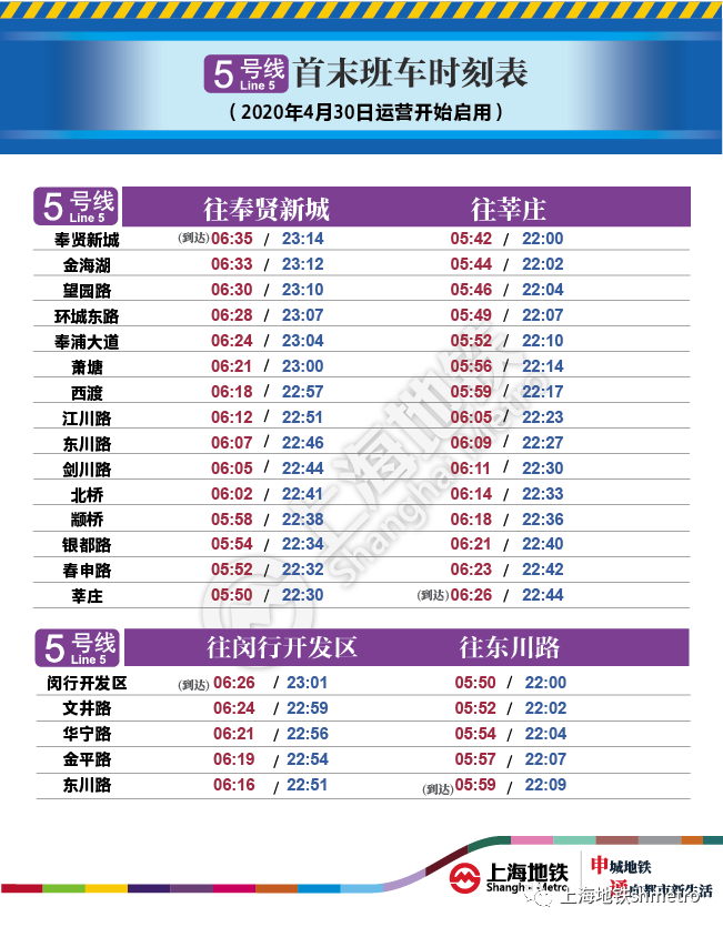 自4月1日起,上海地铁16号线及2号线徐泾东至龙阳路区段,7号线花木路至行知路区段,恢复常态末班车开行。随着设施专项整治施工与列车调试工作的完成,从4月30日起,上海地铁5号线全线及2号线龙阳路至浦东国际机场、7号线行知路至美兰湖区段也将恢复常态末班车开行。至此,之前运营时间临时调整至21时的2、5、7、8、16号线,五线全线均恢复常态末班车时间结束运营。