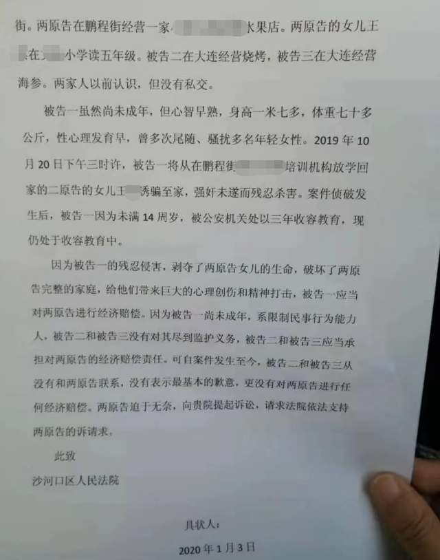 据红星新闻此前报道,2019年10月20日,大连13岁男孩蔡某某杀害10岁女孩王某,警方对犯罪嫌疑人蔡某某实施收容教养,期限为3年。2020年1月3日上午,受害者王某的父母与其代理律师田参军,来到沙河口区人民法院递交民事起诉状,正式对蔡某某及其父母提起民事诉讼,要求对方道歉并索赔一百余万。