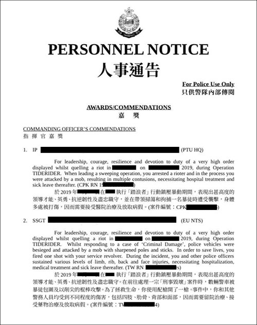 遭泄露的警队嘉奖名单,已将警员及案件信息抹去