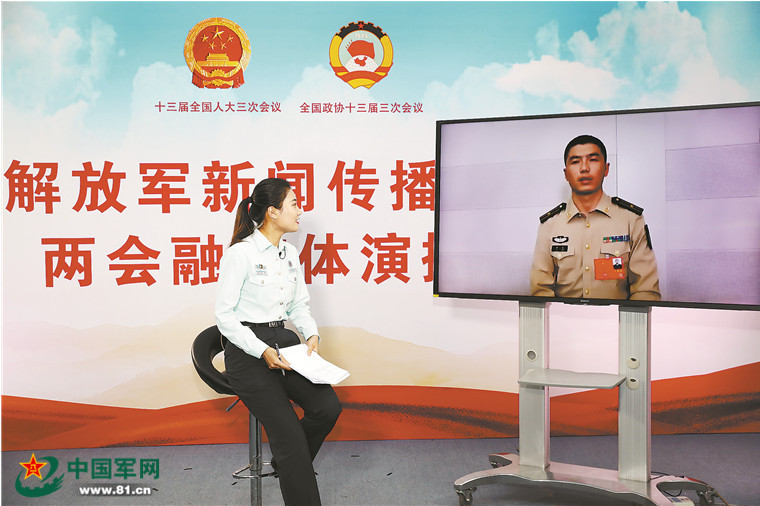 解放军报记者张笑语通过视频连线方式采访军队人大代表尹东。苏鹤摄