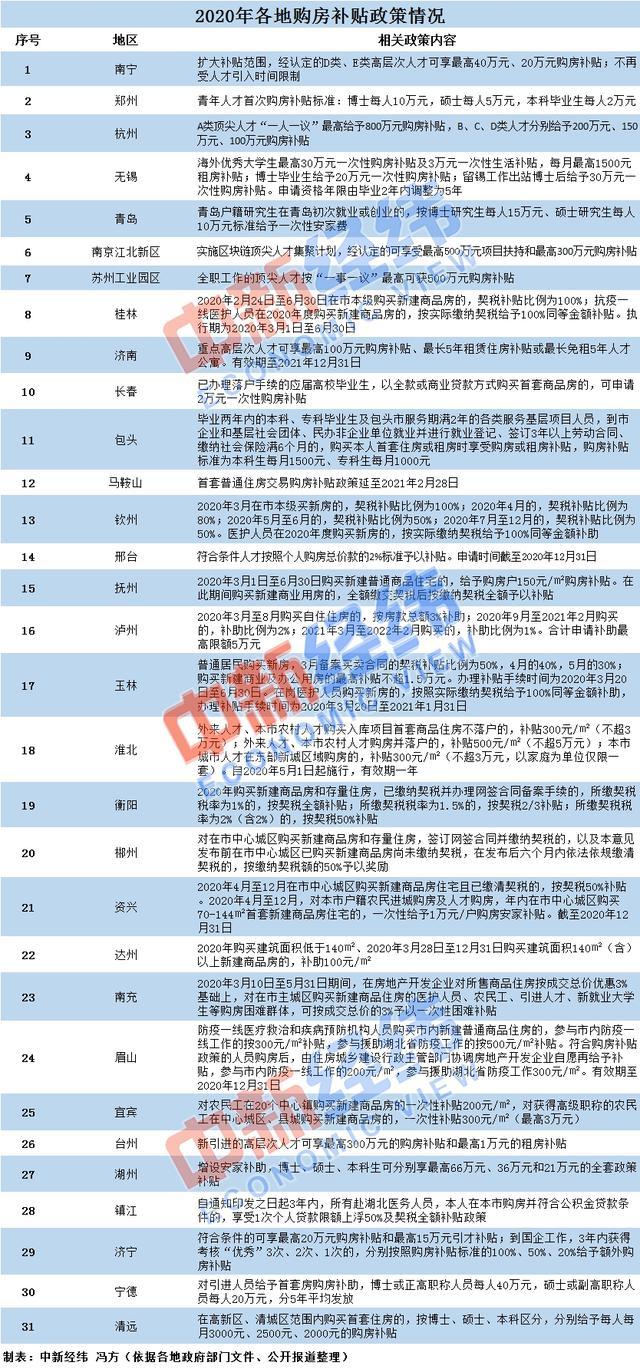 近日,南京江北新区印发通知,提出最高300万元购房补贴的政策。此前,郑州、南宁等地区分别发布或调整购房补贴政策。据统计,年内至少已有30多个地区发布或调整购房补贴政策,其中,有6个地区最高补贴金额超过百万。