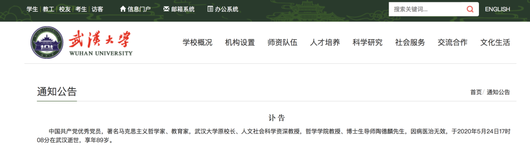 据武汉大学官网消息,我国著名马克思主义哲学家、武汉大学原校长陶德麟教授,于5月24日下午因病医治无效,在武汉逝世,享年89岁。