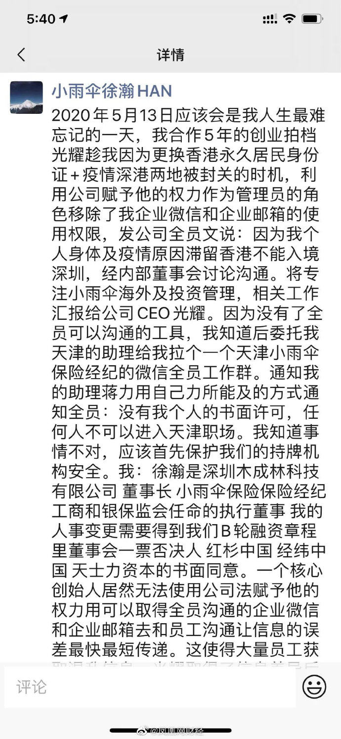虎扑5月14日讯近日,有爆料称,小雨伞保险董事长徐瀚凌晨3点在朋友圈发文称创业伙伴、公司CEO光耀趁机夺权,并夺取了小雨伞保险的财务章和营业执照。新闻发出后引起了网友的广泛讨论,详细内容如下: